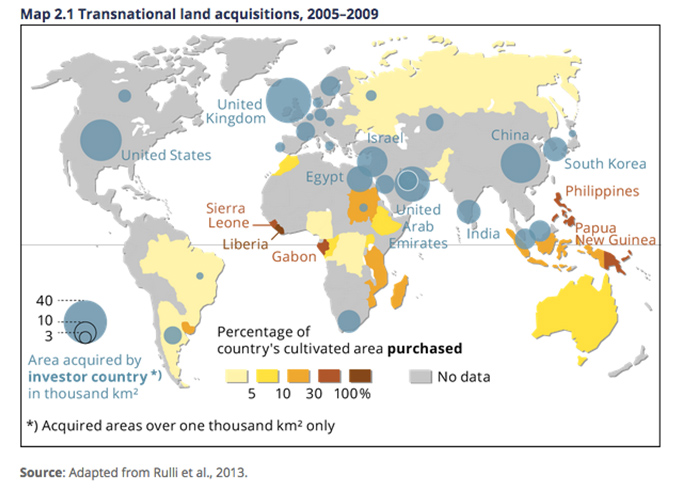 Entre 2005 et 2009, ce furent ainsi déjà pas moins de 470.000 kilomètres carrés qui furent achetés, l’équivalent de la taille de l’Espagne. Dans certains pays, notamment en Afrique, de grands pans des régions agricoles ont été vendus à des investisseurs étrangers, principalement d’Europe, d’Amérique du Nord, de Chine et du Moyen-Orient.