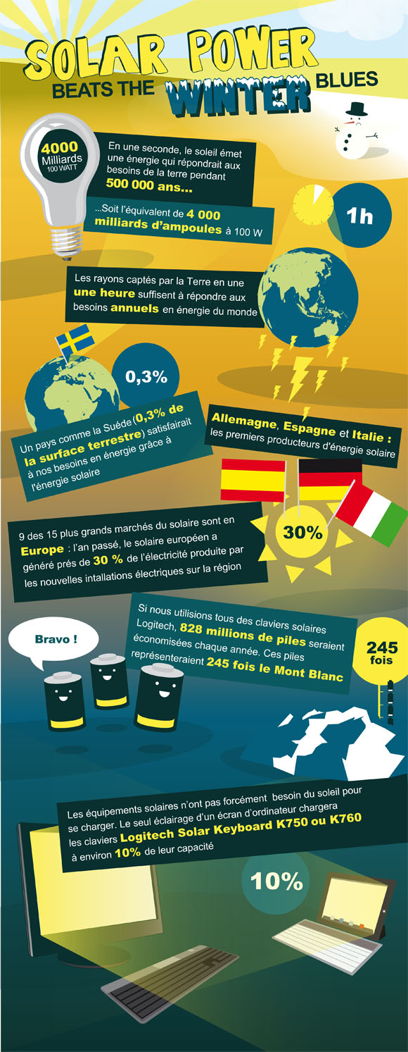 La société Logitech a trouvé une manière intelligente d’expliquer l’intérêt de son nouveau produit, solaire sans fil. En rappelant avec une infographie pédagogique comment la lumière solaire « combat avec succès le blues hivernal ». Et il ne s’agit pas d’une lampe de luminothérapie, mais d’un clavier qui fonctionne à la lumière.