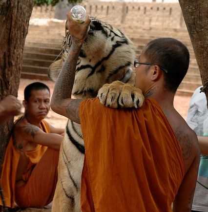 C’est de la pure MALTRAITENCE. Ces pauvres tigres ne bougent absolument pas (même pas un cil) alors que l’humain lui tourne autour, le caresse. Ils sont liés au moyen de très courtes chaines. Que penser du moine qui se donne en spectacle en donnant le biberon à un tigre adulte lié (cloué)à un arbre.