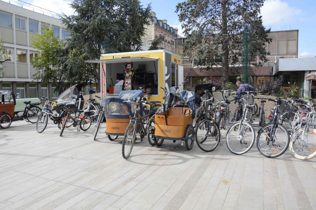 Cet atelier itinérant, qui sillonne l’Île-de-France, stationne tous les jours à proximité des gares RER où les salariés garent leur vélo avant de prendre les transports en commun pour se rendre sur leur lieu de travail. Le vélo est réparé en une journée, pendant que le cycliste est sur son lieu de travail et qu’il n’en a pas besoin.