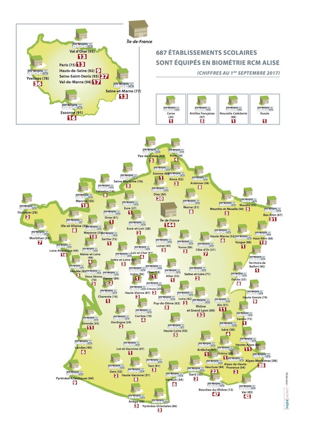 Banalisation, c’est le mot : sur les 101 départements de France métropolitaine, 81 comptent désormais des collèges ou lycées équipés d’une technologie de reconnaissance biométrique par contour de la main… soit 80 % d’entre eux ! À la ville… comme à la campagne !