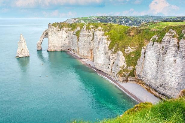 Connue pour ses falaises de craie blanche et ses plages de galets, Étretat offre un magnifique panorama sur l’horizon marin.