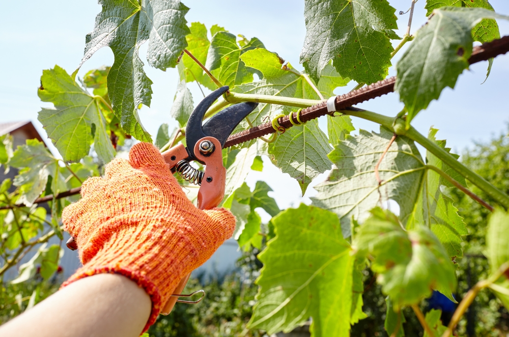 Au mois de février-mars (à la fin février dans le Sud et au début mars au nord de la Loire), taillez les pousses latérales de la vigne en coupant au-dessus du 2e ou 3e bourgeon. Cette action permet de concentrer la fructification sur les pousses proches de la charpente. En général, le premier bourgeon ne produit pas de fruit.