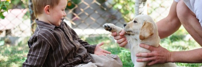 Illustration bannière : Un enfant et son père jouent avec un chiot – © Tymonko Galyna Shutterstock