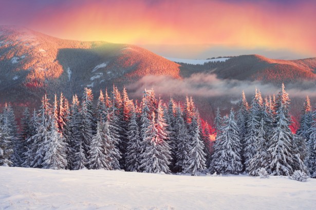 Les couleurs chatoyantes du premier lever du soleil de 2017 sur les paysages enneigés d’Ukraine © Roman Mikhailiuk Shutterstock