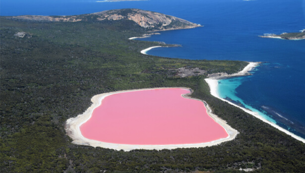 Le Lac hiller est un étonnant lac rose sur ‘l’île du Milieu’, la plus grande des îles qui composent l’Archipel de la Recherche, à environ 130 kilomètres d’Esperance, au sud de l’Australie-Occidentale.