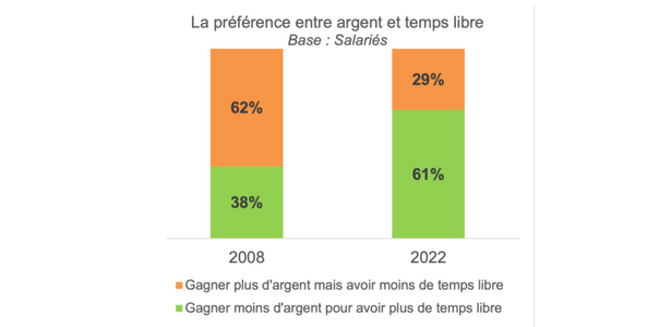 En octobre 2022, 61 % des Français ont déclaré préférer gagner moins d’argent, en diminuant leur temps de travail, mais bénéficier de plus de temps libre. En 2008, ils étaient 62 % à déclarer, au contraire, être prêts à travailler plus pour gagner plus.