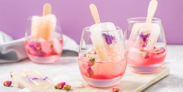 Vous pouvez verser cette limonade à la rose dans des moules pour glace à l’eau ou tout simplement des petits gobelets dans lesquelles vous placez un bâtonnet en bois. Vous laissez le congélateur faire son oeuvre.