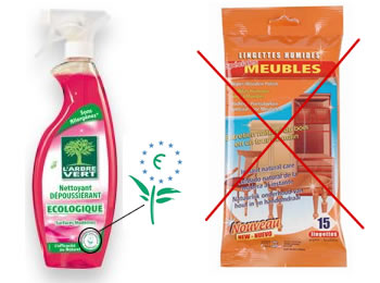 - A l’utilisation : les lingettes jetables génèreraient 3 fois plus de déchets ménagers que le spray et 6 fois plus que les nettoyants liquides.