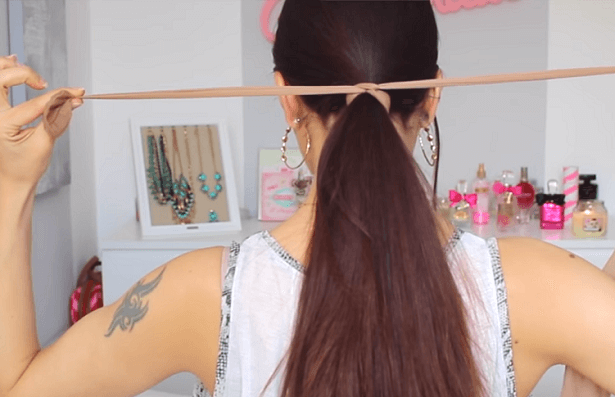 On attache les cheveux avec un élastique en haut de manière assez serrée. Puis on enroule le vieux collant auquel on a coupé les jambes autour des cheveux. On fait deux tours en haut pour qu’il tienne, puis on le serre jusqu’en bas de la chevelure. L’idéal est de ne rien laisser dépasser.