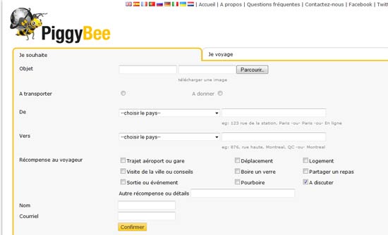 - PiggyBee, initiative belge, propose un service de même type au travers d’une interface visant la practicité. Petit bonus : un site traduit en neuf langues qui permet aussi à l’internaute de proposer un don d’objet, et un système de paiement sécurisé.