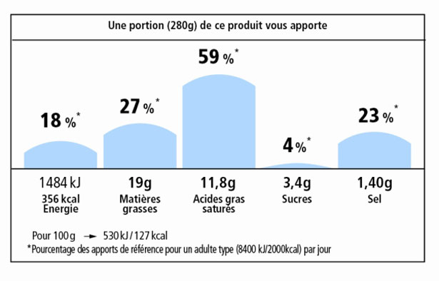 Ce système, mis en oeuvre au Royaume-Uni depuis plusieurs années, est fondé sur une échelle de trois couleurs fournissant la contribution en pourcentage et valeur absolue d’une portion de l’aliment aux apports nutritionnels de référence en énergie, sucre, sel, matières grasses et acides gras saturés.