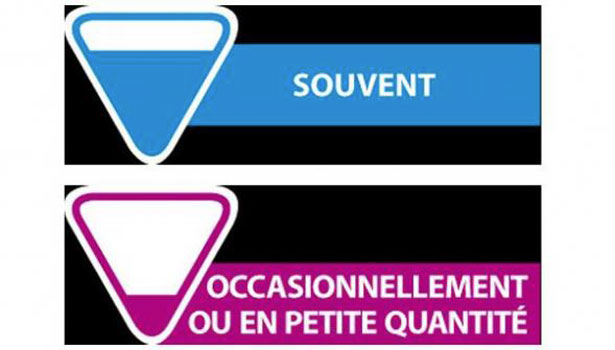 Un système à quatre couleurs comportant une indication sur la fréquence de consommation. Il est construit à partir d’une classification réalisée sur la base de la teneur en nutriments majeurs du produit. Les articles afficheront l’un des quatre visuels, dont voici deux exemples :