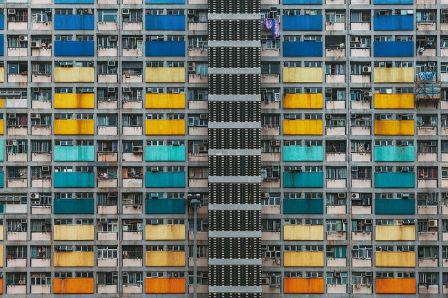 Ci-dessus la cour intérieure d’appartements à Lai tak tseun à Causeway bay.