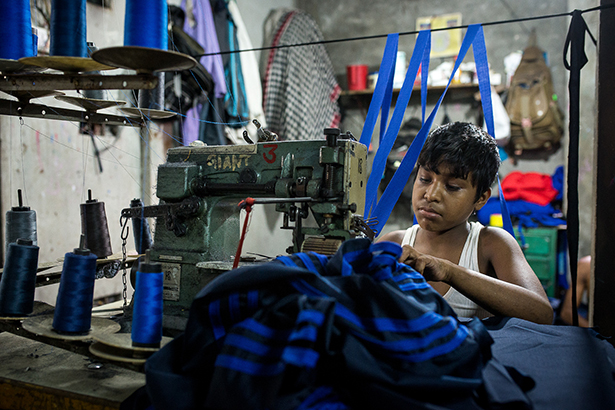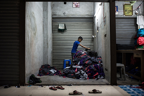 Ce jeune garçon a 11 ans et a quitté son village poussé par son oncle qui ne pouvait subvenir à ses besoins. Depuis deux ans, il travaille sur cette machine complexe et capricieuse qui sert à coudre les trois bandes de la marque Adidas. Sujette à de nombreuses pannes elle fait perdre un temps précieux. Malgré la rigueur et l’ennui de la tâche, celle-ci lui assure une relative sécurité. Ces produits contrefaits alimenteront les bazars de Dhaka.