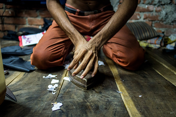 Les outils sont utilisés et réparés de nombreuses fois. Ici, Akash frotte énergiquement son fer électrique sur le sol afin de le nettoyer et d’en chasser les aspérités. Le moindre accroc dans le tissu d’un client pourrait lui valoir d’importantes sanctions.