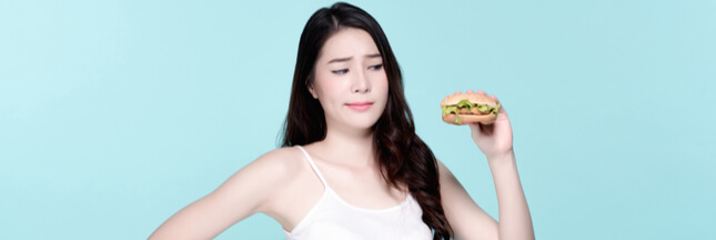Illustration bannière : Femme sceptique devant un hamburger – © Tubiry Photography