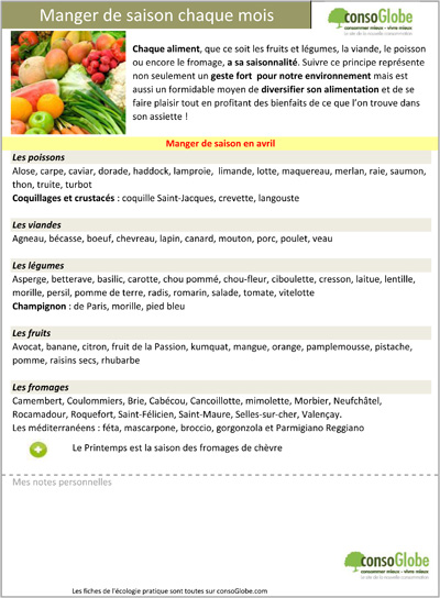 consoGlobe vous aide à choisir mois par mois les poissons, viandes, légumes, fruits et fromages à proposer dans vos menus à l’aide de fiches pratiques à télécharger.