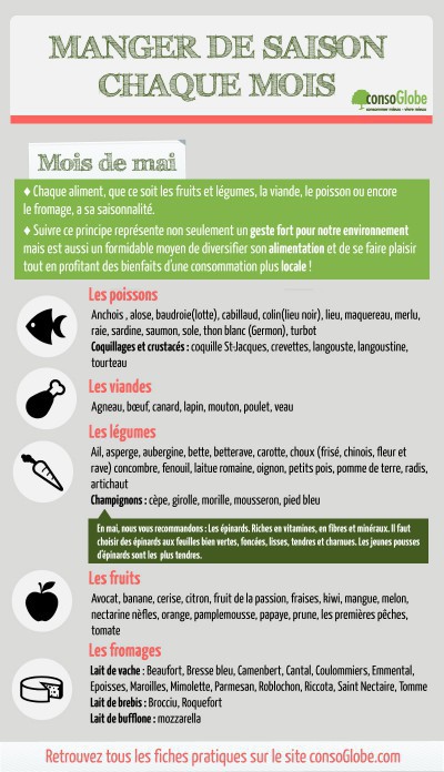 consoGlobe vous aide à choisir mois par mois les poissons, viandes, légumes, fruits et fromages à proposer dans vos menus à l’aide de fiches pratiques à télécharger.