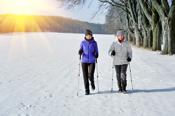 En hiver, la marche nordique se pratique aussi dans la neige