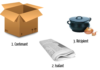 Le récipient peut être éventuellement une cocotte ou autocuiseur avec un couvercle ferme. L’isolant doit se composer de matériaux gardant la chaleur, le plus simple étant une couverture. Le tout peut s’imbriquer dans une boite, qu’on appellera « caisse à cuire » : en carton, en bois, en métal ou même un panier à linge !