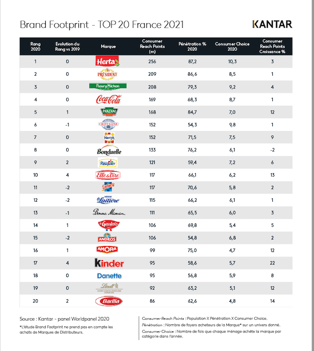 La suite du top 10 comprend, dans l’ordre : Coca-Cola, Panzani, Cristaline, Harry’s, Bonduelle, Pasquier et Elle & Vire.