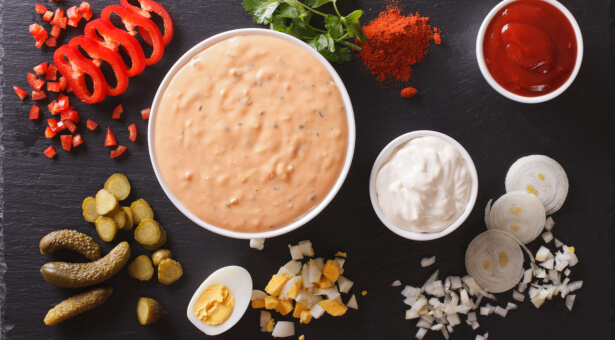 D’une couleur délicate, cette mayonnaise rose a pourtant un sacré caractère ! Ajoutez une cuillère de sauce tomate, une larme de cognac ou de whisky, un soupçon de fromage blanc et une pincée de piment.