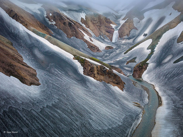 Les champs de glace et les glaciers qui bordent les flancs de la montagne en Islande ont été colorés naturellement avec de la cendre grise, ce qui donne l’impression d’un dessin fait au fusain. La cendre s’installe après avoir été transportée par le vent d’une ancienne éruption volcanique. L’Islande est célèbre pour sa haute concentration de volcans actifs, qui ont d’ailleurs été responsables d’un tiers de la production totale de lave dans le monde.