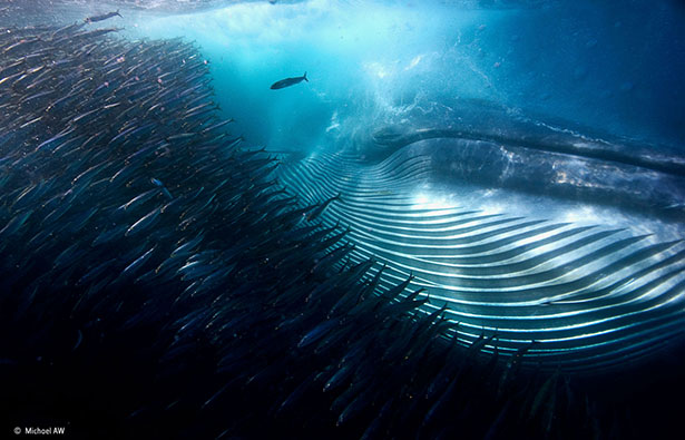 Cette imposante baleine de Bryde traverse une masse de sardines, avalant au passage une centaine de celles-ci. Photographier cette frénésie d’alimentation était un véritable défi pour Michael. Cette scène apparaît lors de la course annuelle de la sardine, lorsque des milliards de sardines migrent le long de la côte sauvage de l’Afrique du Sud.