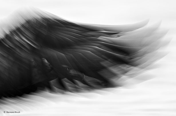 En recadrant et en utilisant une vitesse d’obturation lente, Hermann Hirsch a voulu capturer le moment où un pygargue à queue blanche s’apprête à chasser le poisson. Il estompe la vitesse de l’aile, en utilisant le noir et blanc pour accentuer l’énergie et l’intention de l’oiseau. Avec une envergure de 2,5 mètres, le pygargue est l’aigle le plus grand d’Europe et le quatrième dans le monde.