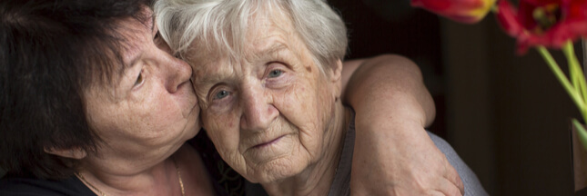 Illustration bannière : Femme embrassant sa vieille maman – © De Visu