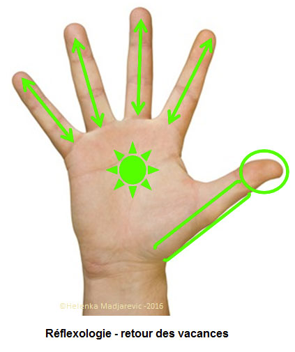 Le massage de l’ensemble des zones réflexes mentionnées vous aidera de ne pas vous laissez porter par le stress de la rentrée et à recommencer votre vie familière en douceur, avec une période de transition.