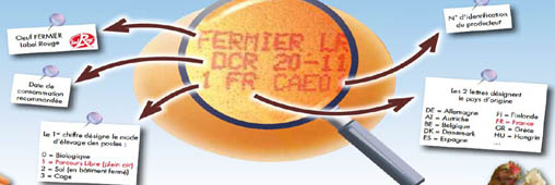Depuis le 1er janvier 2004 des informations précises se trouvent à la fois sur l’emballage et sur l’oeuf lui-même. De cette manière, même si vous achetez des oeufs individuellement, vous serez sûr de votre choix… Cherchez un chiffre suivi des lettres FR. C’est ce qui indique le type d’élevage de 0 à 3.