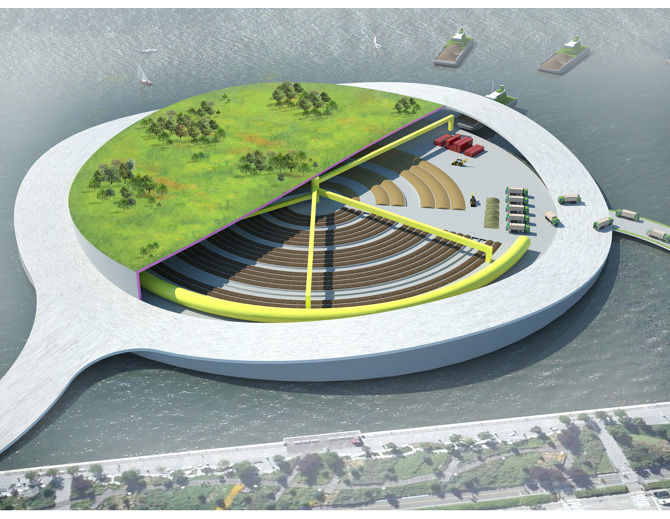 Des architectes du cabinet Present Architecture se sont penchés sur une problématique soulevée par NYC.gov (site officiel de la ville de New-York) : la nécessité de traiter une partie des déchets acheminés jusqu’aux décharges publiques pour le compostage.