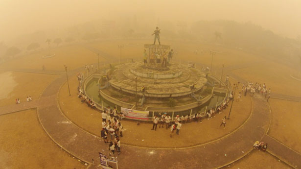 Cette photo a été prise le 4 octobre 2015. le photographe explique qu’il participait, avec des amis, à une campagne de solidarité appelée « Kalteng with love » où ils donnaient gratuitement des masques, du lait et des vitamines pour les habitants de la ville de Palangkaraya, Kalimantan Central en Indonésie. Une épaisse fumée, provoquée par des feux dans les tourbières de Bornéo planait au dessus d’eux. Pendant plus de trois mois, les habitants ont respiré cet air toxique.
