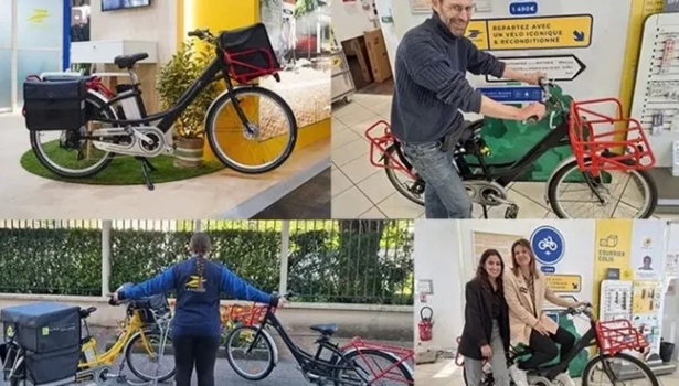 La Poste propose la vente de vélos de facteurs à assistance électrique reconditionnés dans 150 bureaux de poste à travers la France.