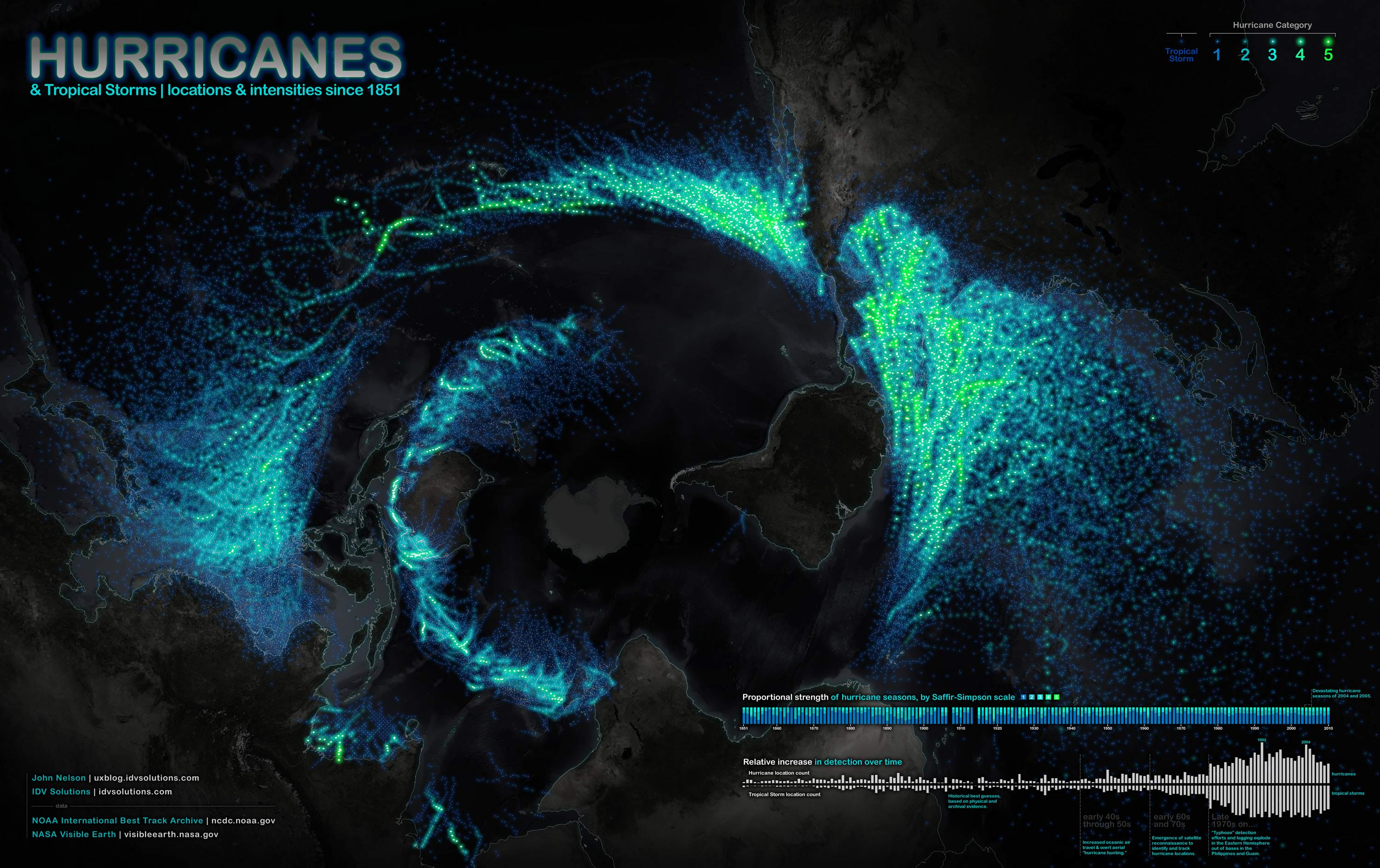 Le développeur John Nelson a eu envie de rendre les données concernant les ouragans plus visuelles. Il s’est ainsi servi de la base de données du National Oceanic and Atmospheric Administration (NOAA), agence fédérale américaine qui étudie la condition des océans et de l’atmosphère. Il a donc rassemblé toutes les informations concernant les temps extrêmes (ouragans et tempêtes tropicales) des dernières années, remontant jusque 1851.
