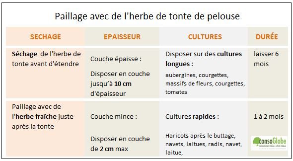 Le paillis de tonte doit être renouvelé plus souvent qu’un paillis de petites branches ou de feuilles mortes. Utilisez les tontes contenant peu de graines et non traitées.