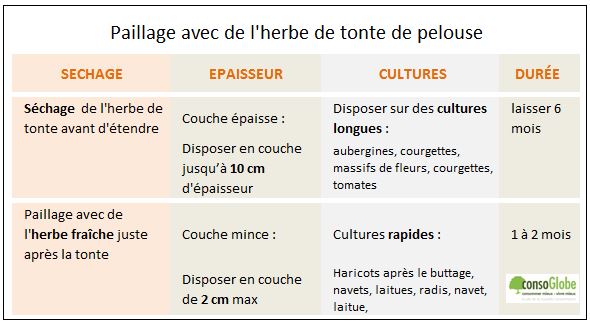 Comme l’herbe de tonte est humide et qu’elle risque de macérer, il vaut mieux la sécher au maximum avant de l’étendre en paillis. Pour cela, étalez-la au maximum au soleil ; retournez-la pour qu’elle sèche bien de tous côtés. Ainsi, avec un paillage bien sec, le paillis ne chauffera pas, ne s’acidifie pas et n’asphyxie donc pas le sol et les racines.