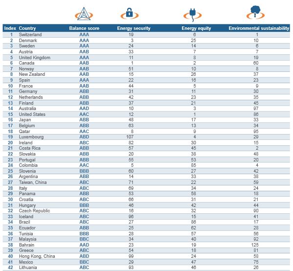 La France est à la 10ème place du palmarès, devant l’Allemagne (11ème) et les États-Unis (15ème). Le mix énergétique français est composé de 75,5 % d’énergie nucléaire, ce qui vaut une bonne note car le nucléaire est considéré par le WEC comme propre et peu cher. Les émissions de CO2 en France ne sont que de 4,89 tonnes par an par habitant. La France est 5ème en termes de coût de l’énergie avec un kWh à 0,18 $ en moyenne.