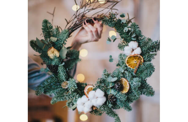 Pour ce faire, enroulez des branches de sapin autours d’un cerceau en métal (ou en réalisant un cercle avec du fil métallique), et fixez-y de l’anis étoilée, des bâtons de cannelle et des rondelles d’agrumes séchés dans lesquels vous aurez plantés des clous de girofle. Libre à vous ensuite de décorer votre couronne avec du ruban, des noeuds et autres charmantes décorations de Noël. Effet garanti !