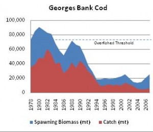 Mais, il y avait une zone où l’espèce restait relativement abondante jusqu’à il y a peu : le fameux banc de sable submergé George Bank, au large de Boston. Pour les pêcheurs américains et canadiens, le banc de sable Georges Bank a toujours été un gisement poissonneux riche en cabillaud et en [[Flétan]].