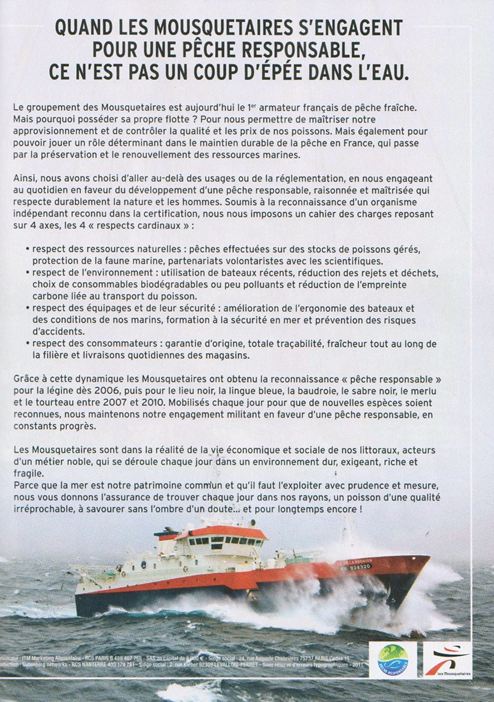 De l’autre, en position d’accusé, le géant de la distribution, Intermarché. Le groupement des Mousquetaires est en effet aux commandes d’une flotte de pêche dont il se vante, car elle lui permet de proposer un poisson très frais à ses clients. Mais voilà, Intermarché va jusqu’à se vanter d’une pêche écologiquement responsable.