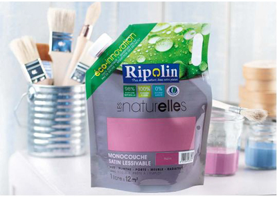 Ripolin innove aussi côté conditionnement avec un emballage souple à bouchon, inédit sur le marché, et qui présente de nombreux avantages (cette éco-innovation permettrait de réduire de 70 % la quantité de plastique par rapport à un pot de peinture classique en plastique ainsi que d‘utiliser la juste quantité de peinture).