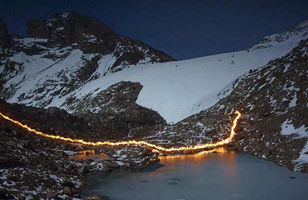 Cette ligne de flamme représente la ligne qu’atteignait anciennement la glace du glacier Lewis dans l’Oregon aux Etats-Unis, qui a diminué de 120 mètres depuis 1987. Une photographie qui met en avant le réchauffement climatique sur notre planète.
