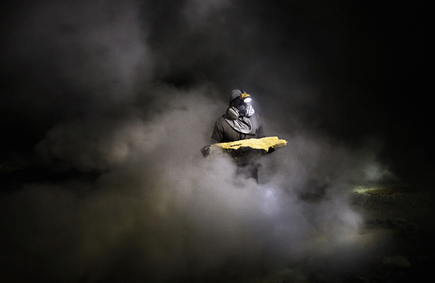 Alpan a 27 ans et est un mineur de souffre depuis l’âge de 17 ans. Comme ses collègues, il va récupérer de l’or à l’intérieur du ventre du volcan Kawah Ijen, situé à l’est de Java en Indonésie. Les mineurs s’engouffrent profondément à la recherche de cet « or du diable ».