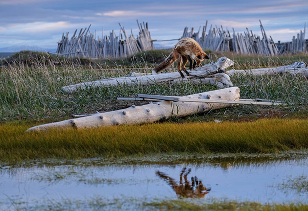 Photographie d’un renard roux à la recherche de campagnols et de lemmings dans l’Arctique canadien. Il aura fallu plusieurs jours d’observations pour se rendre compte que ce renard réussissait presque toutes ses attaques.