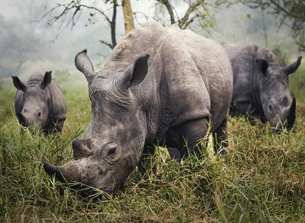 Dans la réserve de rhinocéros de Ziwa en Ouganda, le photographe avait essayé la veille de cette photo, d’immortaliser des rhinocéros blancs, en vain. Le lendemain matin en se réveillant, il tombe face à trois rhinocéros en train de brouter.