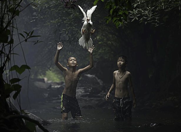 Deux jeunes garçons tente d’attraper un canard près d’une cascade dans la province de Nang Khai en Thaïlande.