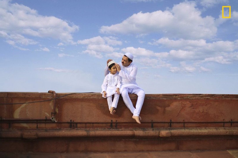 Un père et son fils sont assis en tenue de cérémonie à la mosquée de New Delhi, en Inde, lors de la fête de l’Aid-el-Fitr qui célèbre la fin du ramadan. « Cette photo montre le beau lien entre deux générations » indique le photographe.